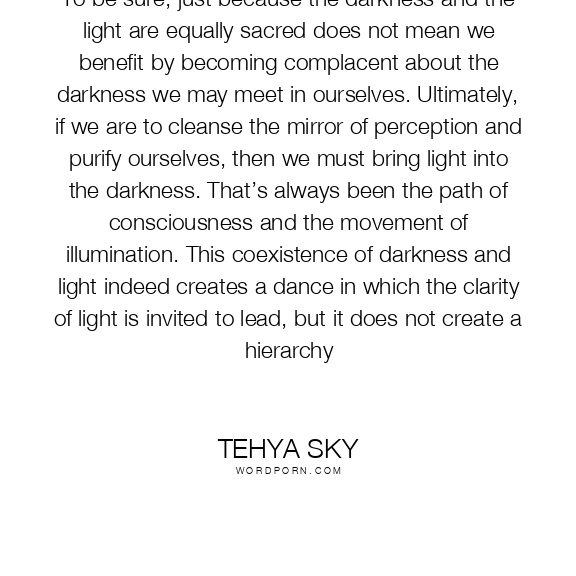 To be sure, just because the darkness and the light are equally sacred does not mean we benefit by becoming complacent about the darkness we may meet in ourselves. Ultimately, if we are to cleanse the mirror of perception and purify ourselves, then we must bring light into the darkness. That’s always been the path of consciousness and the movement of illumination. This coexistence of darkness and light indeed creates a dance in which the clarity of light is invited to lead, but it does not create a hierarchy
