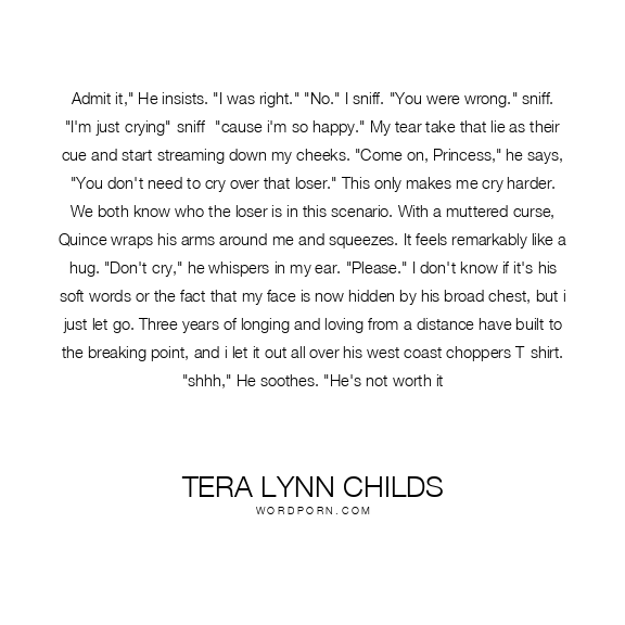 Admit it," He insists. "I was right." "No." I sniff. "You were wrong." sniff. "I'm just crying"-sniff- "cause i'm so happy." My tear take that lie as their cue and start streaming down my cheeks. "Come on, Princess," he says, "You don't need to cry over that loser." This only makes me cry harder. We both know who the loser is in this scenario. With a muttered curse, Quince wraps his arms around me and squeezes. It feels remarkably like a hug. "Don't cry," he whispers in my ear. "Please." I don't know if it's his soft words or the fact that my face is now hidden by his broad chest, but i just let go. Three years of longing and loving from a distance have built to the breaking point, and i let it out all over his west coast choppers T-shirt. "shhh," He soothes. "He's not worth it
