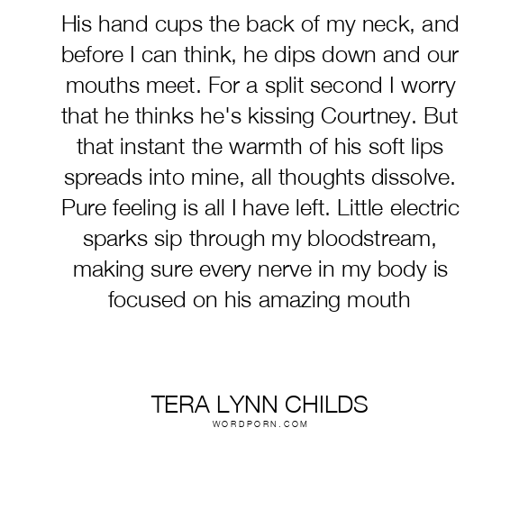 His hand cups the back of my neck, and before I can think, he dips down and our mouths meet. For a split second I worry that he thinks he's kissing Courtney. But that instant the warmth of his soft lips spreads into mine, all thoughts dissolve. Pure feeling is all I have left. Little electric sparks sip through my bloodstream, making sure every nerve in my body is focused on his amazing mouth
