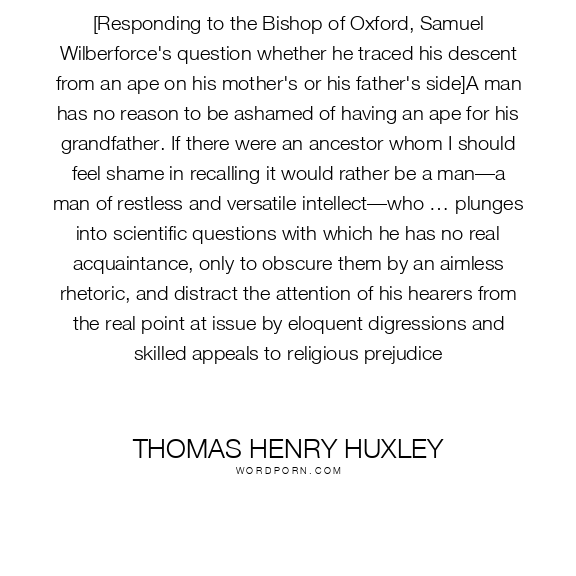 [Responding to the Bishop of Oxford, Samuel Wilberforce's question whether he traced his descent from an ape on his mother's or his father's side]A man has no reason to be ashamed of having an ape for his grandfather. If there were an ancestor whom I should feel shame in recalling it would rather be a man—a man of restless and versatile intellect—who … plunges into scientific questions with which he has no real acquaintance, only to obscure them by an aimless rhetoric, and distract the attention of his hearers from the real point at issue by eloquent digressions and skilled appeals to religious prejudice