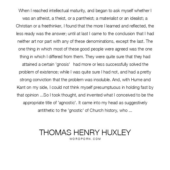When I reached intellectual maturity, and began to ask myself whether I was an atheist, a theist, or a pantheist; a materialist or an idealist; a Christian or a freethinker, I found that the more I learned and reflected, the less ready was the answer; until at last I came to the conclusion that I had neither art nor part with any of these denominations, except the last. The one thing in which most of these good people were agreed was the one thing in which I differed from them. They were quite sure that they had attained a certain 'gnosis'--had more or less successfully solved the problem of existence; while I was quite sure I had not, and had a pretty strong conviction that the problem was insoluble. And, with Hume and Kant on my side, I could not think myself presumptuous in holding fast by that opinion ...So I took thought, and invented what I conceived to be the appropriate title of 'agnostic'. It came into my head as suggestively antithetic to the 'gnostic' of Church history, who professed to know so much about the very things of which I was ignorant; and I took the earliest opportunity of parading it at our Society, to show that I, too, had a tail, like the other foxes