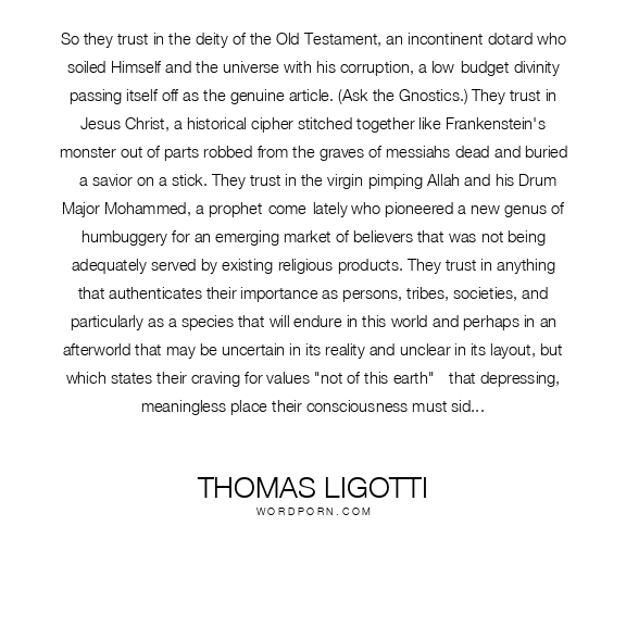 So they trust in the deity of the Old Testament, an incontinent dotard who soiled Himself and the universe with his corruption, a low-budget divinity passing itself off as the genuine article. (Ask the Gnostics.) They trust in Jesus Christ, a historical cipher stitched together like Frankenstein's monster out of parts robbed from the graves of messiahs dead and buried - a savior on a stick. They trust in the virgin-pimping Allah and his Drum Major Mohammed, a prophet-come-lately who pioneered a new genus of humbuggery for an emerging market of believers that was not being adequately served by existing religious products. They trust in anything that authenticates their importance as persons, tribes, societies, and particularly as a species that will endure in this world and perhaps in an afterworld that may be uncertain in its reality and unclear in its layout, but which states their craving for values "not of this earth" - that depressing, meaningless place their consciousness must sidestep every day