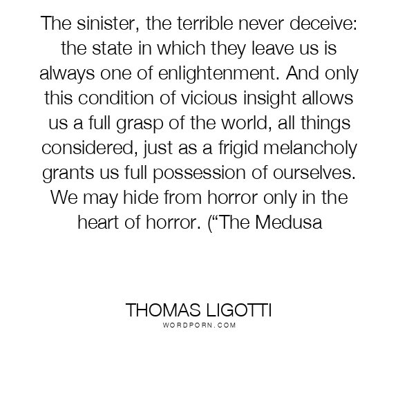 The sinister, the terrible never deceive: the state in which they leave us is always one of enlightenment. And only this condition of vicious insight allows us a full grasp of the world, all things considered, just as a frigid melancholy grants us full possession of ourselves. We may hide from horror only in the heart of horror. (“The Medusa