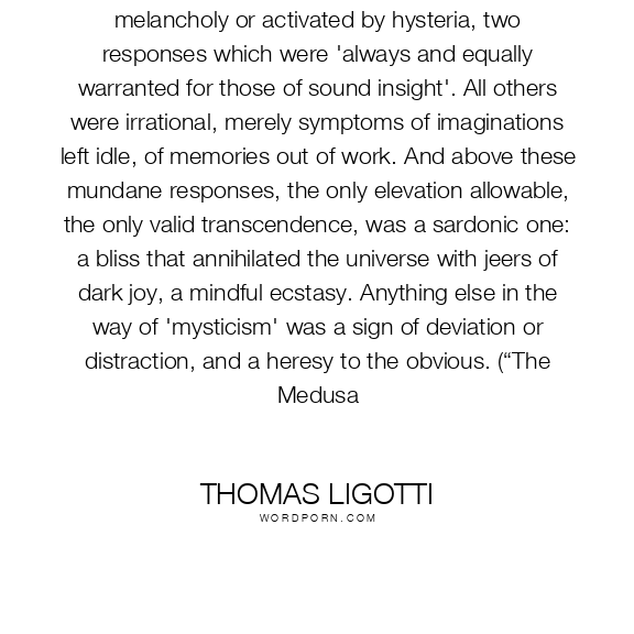 To be sane, he held, was either to be sedated by melancholy or activated by hysteria, two responses which were 'always and equally warranted for those of sound insight'. All others were irrational, merely symptoms of imaginations left idle, of memories out of work. And above these mundane responses, the only elevation allowable, the only valid transcendence, was a sardonic one: a bliss that annihilated the universe with jeers of dark joy, a mindful ecstasy. Anything else in the way of 'mysticism' was a sign of deviation or distraction, and a heresy to the obvious. (“The Medusa