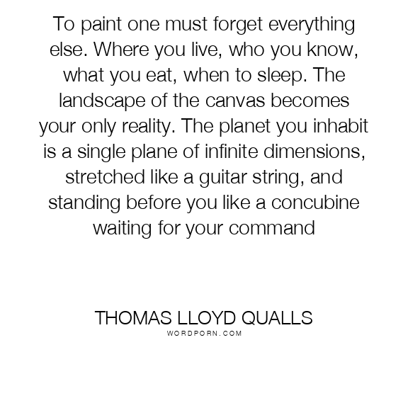 To paint one must forget everything else. Where you live, who you know, what you eat, when to sleep. The landscape of the canvas becomes your only reality. The planet you inhabit is a single plane of infinite dimensions, stretched like a guitar string, and standing before you like a concubine waiting for your command