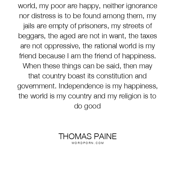 When it can be said by any country in the world, my poor are happy, neither ignorance nor distress is to be found among them, my jails are empty of prisoners, my streets of beggars, the aged are not in want, the taxes are not oppressive, the rational world is my friend because I am the friend of happiness. When these things can be said, then may that country boast its constitution and government. Independence is my happiness, the world is my country and my religion is to do good