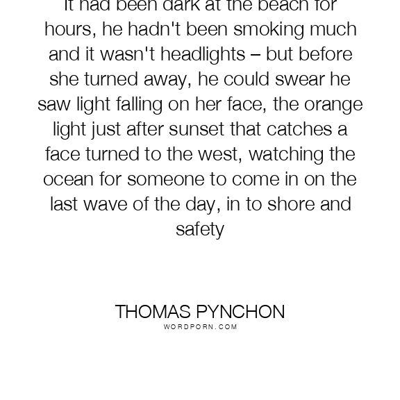 It had been dark at the beach for hours, he hadn't been smoking much and it wasn't headlights – but before she turned away, he could swear he saw light falling on her face, the orange light just after sunset that catches a face turned to the west, watching the ocean for someone to come in on the last wave of the day, in to shore and safety