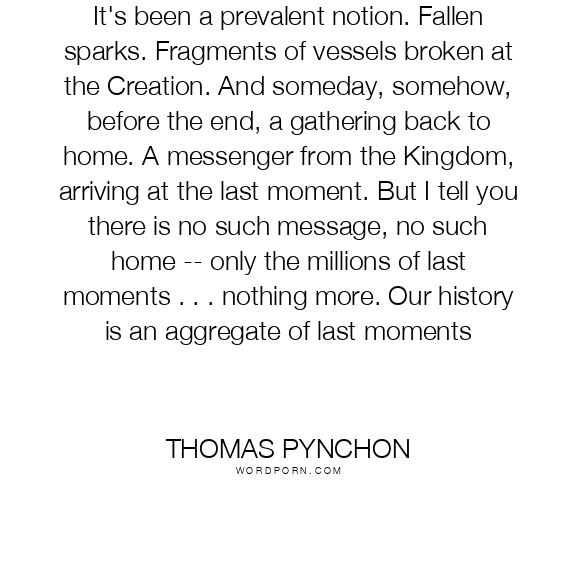 It's been a prevalent notion. Fallen sparks. Fragments of vessels broken at the Creation. And someday, somehow, before the end, a gathering back to home. A messenger from the Kingdom, arriving at the last moment. But I tell you there is no such message, no such home -- only the millions of last moments . . . nothing more. Our history is an aggregate of last moments