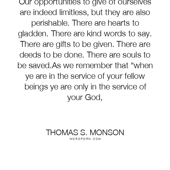 Our opportunities to give of ourselves are indeed limitless, but they are also perishable. There are hearts to gladden. There are kind words to say. There are gifts to be given. There are deeds to be done. There are souls to be saved.As we remember that “when ye are in the service of your fellow beings ye are only in the service of your God,