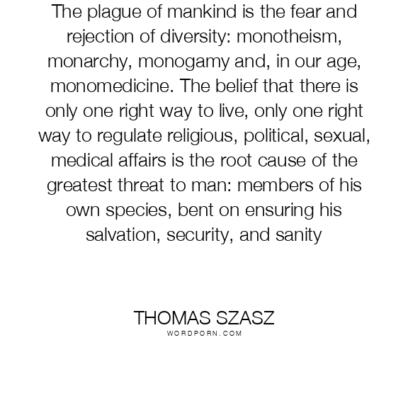 The plague of mankind is the fear and rejection of diversity: monotheism, monarchy, monogamy and, in our age, monomedicine. The belief that there is only one right way to live, only one right way to regulate religious, political, sexual, medical affairs is the root cause of the greatest threat to man: members of his own species, bent on ensuring his salvation, security, and sanity
