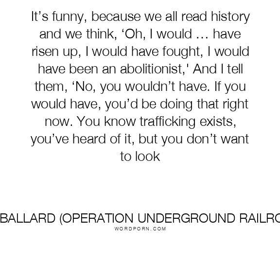 It’s funny, because we all read history and we think, ‘Oh, I would … have risen up, I would have fought, I would have been an abolitionist,' And I tell them, ‘No, you wouldn’t have. If you would have, you’d be doing that right now. You know trafficking exists, you’ve heard of it, but you don’t want to look