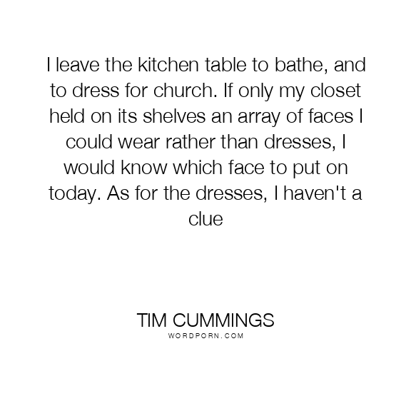 I leave the kitchen table to bathe, and to dress for church. If only my closet held on its shelves an array of faces I could wear rather than dresses, I would know which face to put on today. As for the dresses, I haven't a clue
