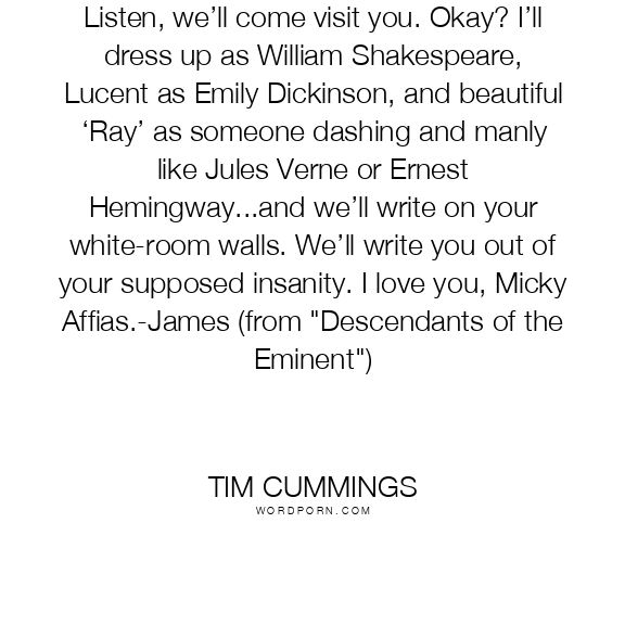 Listen, we’ll come visit you. Okay? I’ll dress up as William Shakespeare, Lucent as Emily Dickinson, and beautiful ‘Ray’ as someone dashing and manly like Jules Verne or Ernest Hemingway...and we’ll write on your white-room walls. We’ll write you out of your supposed insanity. I love you, Micky Affias.-James (from "Descendants of the Eminent")