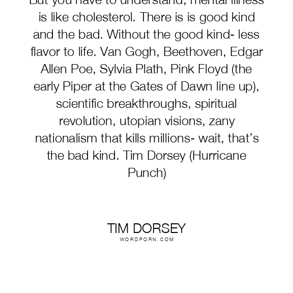 But you have to understand, mental illness is like cholesterol. There is is good kind and the bad. Without the good kind- less flavor to life. Van Gogh, Beethoven, Edgar Allen Poe, Sylvia Plath, Pink Floyd (the early Piper at the Gates of Dawn line up), scientific breakthroughs, spiritual revolution, utopian visions, zany nationalism that kills millions- wait, that’s the bad kind. Tim Dorsey (Hurricane Punch)