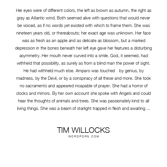Her eyes were of different colors, the left as brown as autumn, the right as gray as Atlantic wind. Both seemed alive with questions that would never be voiced, as if no words yet existed with which to frame them. She was nineteen years old, or thereabouts; her exact age was unknown. Her face was as fresh as an apple and as delicate as blossom, but a marked depression in the bones beneath her left eye gave her features a disturbing asymmetry. Her mouth never curved into a smile. God, it seemed, had withheld that possibility, as surely as from a blind man the power of sight. He had withheld much else. Amparo was touched—by genius, by madness, by the Devil, or by a conspiracy of all these and more. She took no sacraments and appeared incapable of prayer. She had a horror of clocks and mirrors. By her own account she spoke with Angels and could hear the thoughts of animals and trees. She was passionately kind to all living things. She was a beam of starlight trapped in flesh and awaiting only the moment when it would continue on its journey into forever