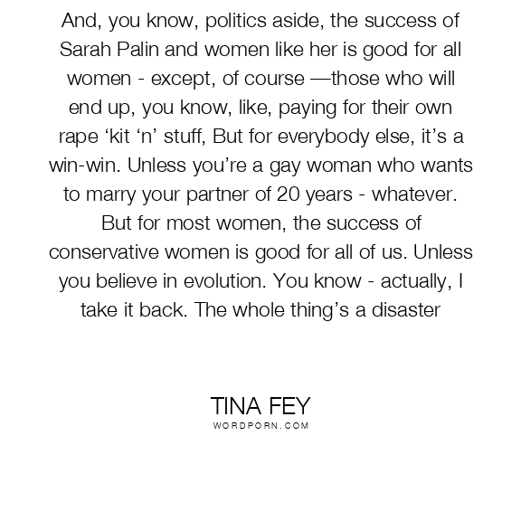 And, you know, politics aside, the success of Sarah Palin and women like her is good for all women - except, of course —those who will end up, you know, like, paying for their own rape ‘kit ‘n’ stuff, But for everybody else, it’s a win-win. Unless you’re a gay woman who wants to marry your partner of 20 years - whatever. But for most women, the success of conservative women is good for all of us. Unless you believe in evolution. You know - actually, I take it back. The whole thing’s a disaster