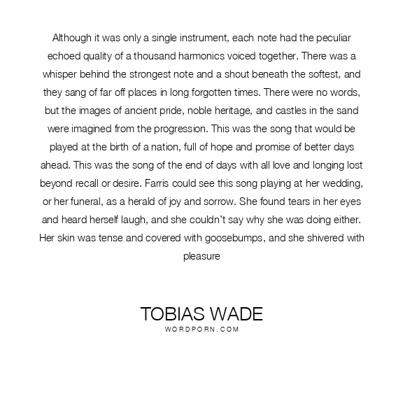 Although it was only a single instrument, each note had the peculiar echoed quality of a thousand harmonics voiced together. There was a whisper behind the strongest note and a shout beneath the softest, and they sang of far off places in long forgotten times. There were no words, but the images of ancient pride, noble heritage, and castles in the sand were imagined from the progression. This was the song that would be played at the birth of a nation, full of hope and promise of better days ahead. This was the song of the end of days with all love and longing lost beyond recall or desire. Farris could see this song playing at her wedding, or her funeral, as a herald of joy and sorrow. She found tears in her eyes and heard herself laugh, and she couldn’t say why she was doing either. Her skin was tense and covered with goosebumps, and she shivered with pleasure