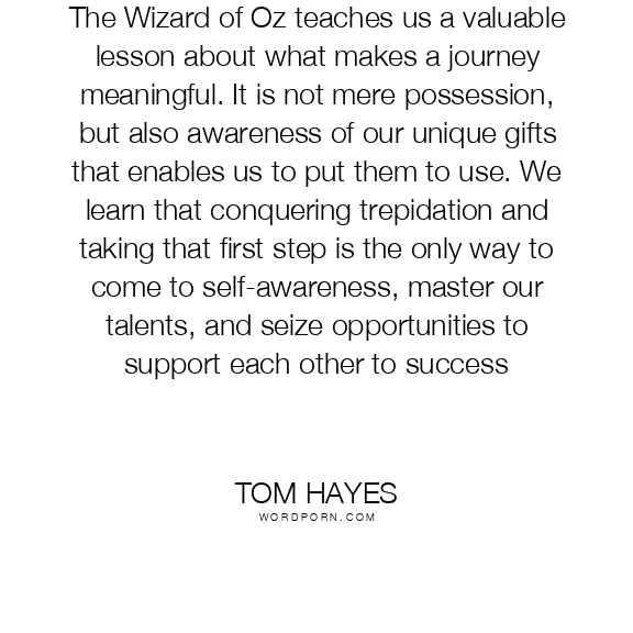 The Wizard of Oz teaches us a valuable lesson about what makes a journey meaningful. It is not mere possession, but also awareness of our unique gifts that enables us to put them to use. We learn that conquering trepidation and taking that first step is the only way to come to self-awareness, master our talents, and seize opportunities to support each other to success
