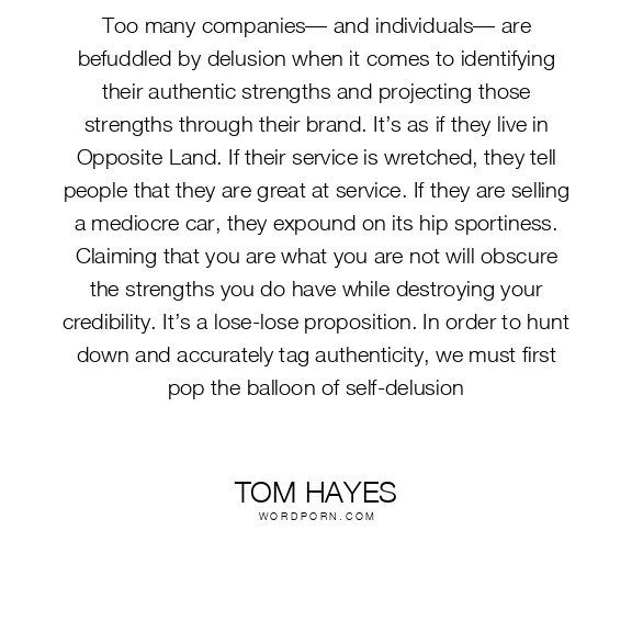 Too many companies— and individuals— are befuddled by delusion when it comes to identifying their authentic strengths and projecting those strengths through their brand. It’s as if they live in Opposite Land. If their service is wretched, they tell people that they are great at service. If they are selling a mediocre car, they expound on its hip sportiness. Claiming that you are what you are not will obscure the strengths you do have while destroying your credibility. It’s a lose-lose proposition. In order to hunt down and accurately tag authenticity, we must first pop the balloon of self-delusion