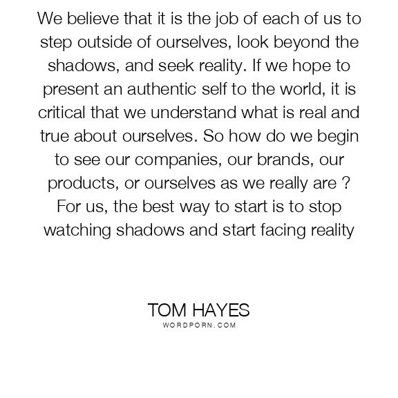 We believe that it is the job of each of us to step outside of ourselves, look beyond the shadows, and seek reality. If we hope to present an authentic self to the world, it is critical that we understand what is real and true about ourselves. So how do we begin to see our companies, our brands, our products, or ourselves as we really are ? For us, the best way to start is to stop watching shadows and start facing reality