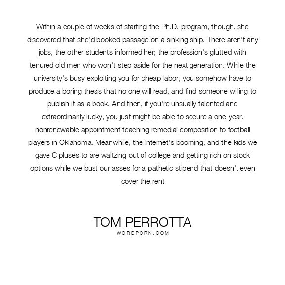 Within a couple of weeks of starting the Ph.D. program, though, she discovered that she'd booked passage on a sinking ship. There aren't any jobs, the other students informed her; the profession's glutted with tenured old men who won't step aside for the next generation. While the university's busy exploiting you for cheap labor, you somehow have to produce a boring thesis that no one will read, and find someone willing to publish it as a book. And then, if you're unsually talented and extraordinarily lucky, you just might be able to secure a one-year, nonrenewable appointment teaching remedial composition to football players in Oklahoma. Meanwhile, the Internet's booming, and the kids we gave C pluses to are waltzing out of college and getting rich on stock options while we bust our asses for a pathetic stipend that doesn't even cover the rent