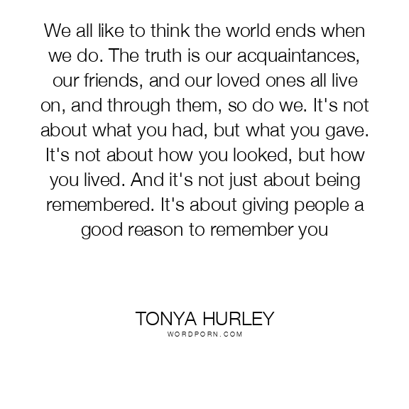 We all like to think the world ends when we do. The truth is our acquaintances, our friends, and our loved ones all live on, and through them, so do we. It's not about what you had, but what you gave. It's not about how you looked, but how you lived. And it's not just about being remembered. It's about giving people a good reason to remember you