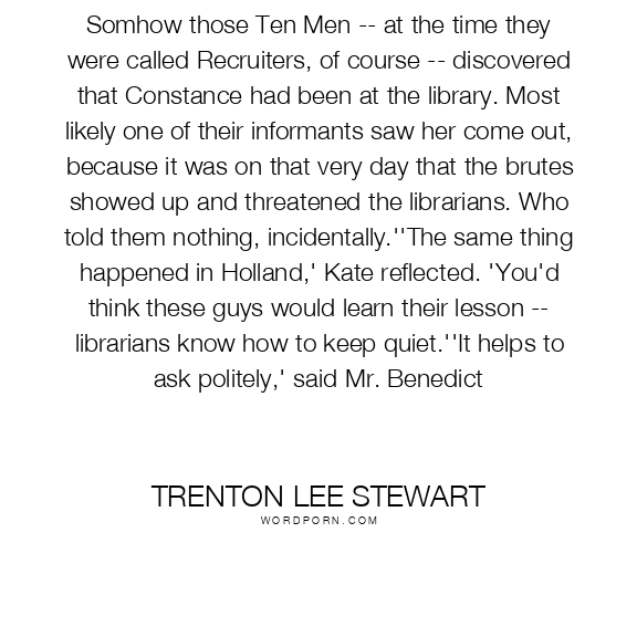 Trenton Lee Stewart quote. Somhow those Ten Men -- at the time they were called Recruiters, of course -- discovered that Constance had been at the library. Most likely one of their informants saw her come out, because it was on that very day that the brutes showed up and threatened the librarians. Who told them nothing, incidentally.''The same thing happened in Holland,' Kate reflected. 'You'd think these guys would learn their lesson -- librarians know how to keep quiet.''It helps to ask politely,' said Mr. Benedict