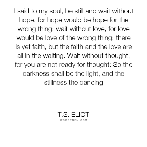 I said to my soul, be still and wait without hope, for hope would be hope for the wrong thing; wait without love, for love would be love of the wrong thing; there is yet faith, but the faith and the love are all in the waiting. Wait without thought, for you are not ready for thought: So the darkness shall be the light, and the stillness the dancing
