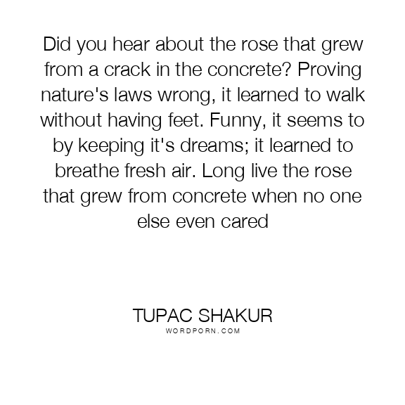 Did you hear about the rose that grew from a crack in the concrete? Proving nature's laws wrong, it learned to walk without having feet. Funny, it seems to by keeping it's dreams; it learned to breathe fresh air. Long live the rose that grew from concrete when no one else even cared