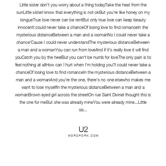 Little sister don't you worry about a thing todayTake the heat from the sunLittle sisterI know that everything is not okBut you're like honey on my tongueTrue love never can be rentBut only true love can keep beauty innocentI could never take a chanceOf losing love to find romanceIn the mysterious distanceBetween a man and a womanNo I could never take a chance'Cause I could never understandThe mysterious distanceBetween a man and a womanYou can run from loveAnd if it's really love it will find youCatch you by the heelBut you can't be numb for loveThe only pain is to feel nothing at allHow can I hurt when I'm holding you?I could never take a chanceOf losing love to find romanceIn the mysterious distanceBetween a man and a womanAnd you're the one, there's no-one elsewho makes me want to lose myselfIn the mysterious distanceBetween a man and a womanBrown eyed girl across the streetOn rue Saint DivineI thought this is the one for meBut she was already mineYou were already mine...Little sisterI've been sleeping in the street againLike a stray dogLittle sisterI've been trying to feel complete againBut you're gone and so is GodThe soul needs beauty for a soul mateWhen the soul wants...the soul waits ...No I could never take a chanceOf losing love to find romanceIn the mysterious distanceBetween a man and a womanFor love and FAITH AND SEX and fearAnd all the things that keep us hereIn the mysterious distanceBetween a man and a womanHow can I hurt when I'm holding you?