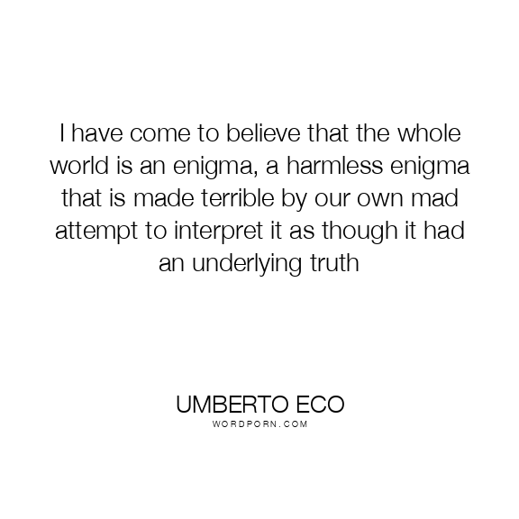 I have come to believe that the whole world is an enigma, a harmless enigma that is made terrible by our own mad attempt to interpret it as though it had an underlying truth