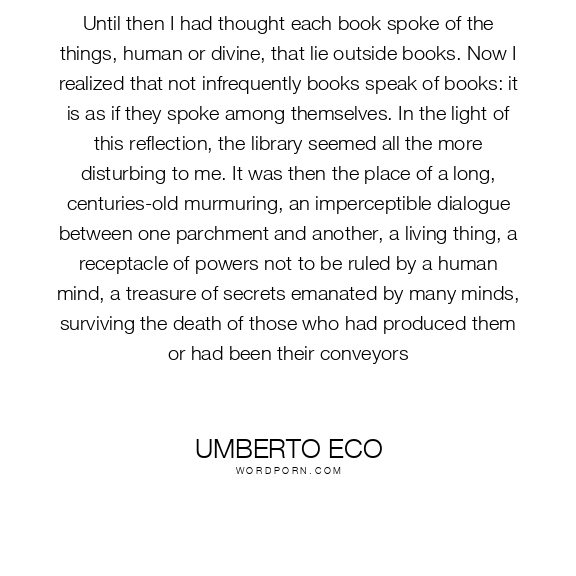 Until then I had thought each book spoke of the things, human or divine, that lie outside books. Now I realized that not infrequently books speak of books: it is as if they spoke among themselves. In the light of this reflection, the library seemed all the more disturbing to me. It was then the place of a long, centuries-old murmuring, an imperceptible dialogue between one parchment and another, a living thing, a receptacle of powers not to be ruled by a human mind, a treasure of secrets emanated by many minds, surviving the death of those who had produced them or had been their conveyors