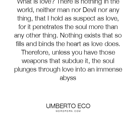 What is love? There is nothing in the world, neither man nor Devil nor any thing, that I hold as suspect as love, for it penetrates the soul more than any other thing. Nothing exists that so fills and binds the heart as love does. Therefore, unless you have those weapons that subdue it, the soul plunges through love into an immense abyss