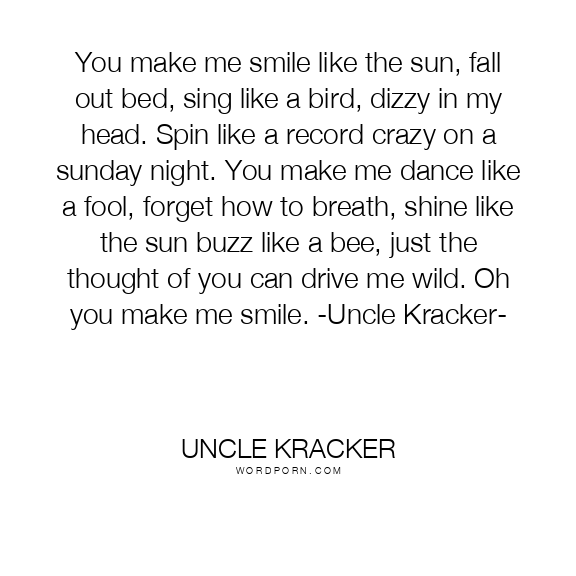 You make me smile like the sun, fall out bed, sing like a bird, dizzy in my head. Spin like a record crazy on a sunday night. You make me dance like a fool, forget how to breath, shine like the sun buzz like a bee, just the thought of you can drive me wild. Oh you make me smile. -Uncle Kracker-