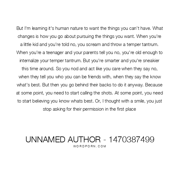 But I'm learning it's human nature to want the things you can't have. What changes is how you go about pursuing the things you want. When you're a little kid and you're told no, you scream and throw a temper tantrum. When you're a teenager and your parents tell you no, you're old enough to internalize your temper tantrum. But you're smarter and you're sneakier this time around. So you nod and act like you care when they say no, when they tell you who you can be friends with, when they say the know what's best. But then you go behind their backs to do it anyway. Because at some point, you need to start calling the shots. At some point, you need to start believing you know whats best. Or, I thought with a smile, you just stop asking for their permission in the first place
