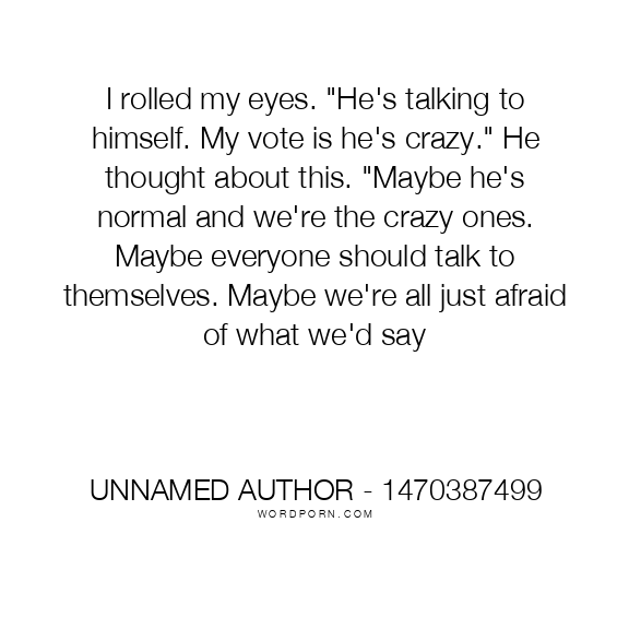 I rolled my eyes. "He's talking to himself. My vote is he's crazy." He thought about this. "Maybe he's normal and we're the crazy ones. Maybe everyone should talk to themselves. Maybe we're all just afraid of what we'd say