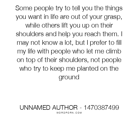 Some people try to tell you the things you want in life are out of your grasp, while others lift you up on their shoulders and help you reach them. I may not know a lot, but I prefer to fill my life with people who let me climb on top of their shoulders, not people who try to keep me planted on the ground