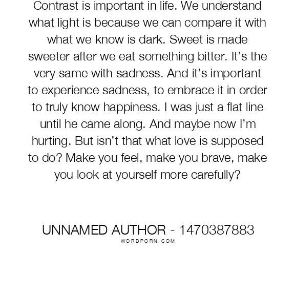 Contrast is important in life. We understand what light is because we can compare it with what we know is dark. Sweet is made sweeter after we eat something bitter. It’s the very same with sadness. And it’s important to experience sadness, to embrace it in order to truly know happiness. I was just a flat line until he came along. And maybe now I’m hurting. But isn’t that what love is supposed to do? Make you feel, make you brave, make you look at yourself more carefully?