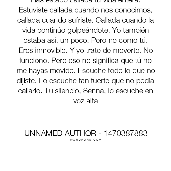 Has estado callada tu vida entera. Estuviste callada cuando nos conocimos, callada cuando sufriste. Callada cuando la vida continúo golpeándote. Yo también estaba así, un poco. Pero no como tú. Eres inmovible. Y yo trate de moverte. No funciono. Pero eso no significa que tú no me hayas movido. Escuche todo lo que no dijiste. Lo escuche tan fuerte que no podía callarlo. Tu silencio, Senna, lo escuche en voz alta