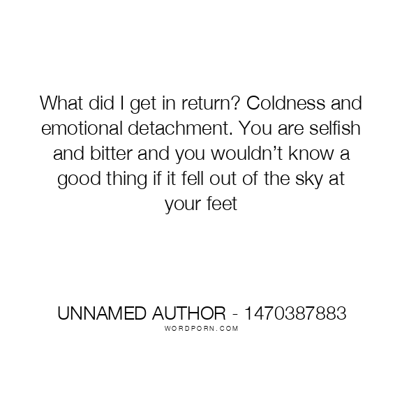 What did I get in return? Coldness and emotional detachment. You are selfish and bitter and you wouldn’t know a good thing if it fell out of the sky at your feet