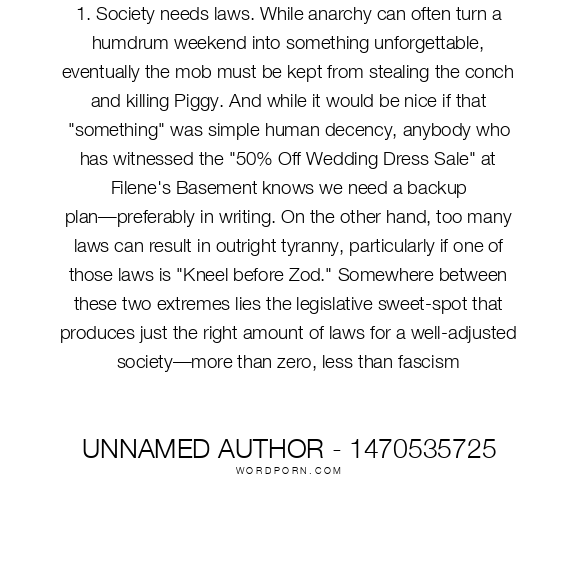1. Society needs laws. While anarchy can often turn a humdrum weekend into something unforgettable, eventually the mob must be kept from stealing the conch and killing Piggy. And while it would be nice if that "something" was simple human decency, anybody who has witnessed the "50% Off Wedding Dress Sale" at Filene's Basement knows we need a backup plan—preferably in writing. On the other hand, too many laws can result in outright tyranny, particularly if one of those laws is "Kneel before Zod." Somewhere between these two extremes lies the legislative sweet-spot that produces just the right amount of laws for a well-adjusted society—more than zero, less than fascism