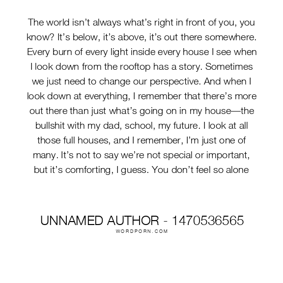 The world isn’t always what’s right in front of you, you know? It’s below, it’s above, it’s out there somewhere. Every burn of every light inside every house I see when I look down from the rooftop has a story. Sometimes we just need to change our perspective. And when I look down at everything, I remember that there’s more out there than just what’s going on in my house—the bullshit with my dad, school, my future. I look at all those full houses, and I remember, I’m just one of many. It’s not to say we’re not special or important, but it’s comforting, I guess. You don’t feel so alone