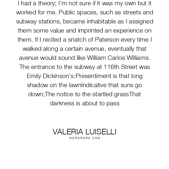 I had a theory; I’m not sure if it was my own but it worked for me. Public spaces, such as streets and subway stations, became inhabitable as I assigned them some value and imprinted an experience on them. If I recited a snatch of Paterson every time I walked along a certain avenue, eventually that avenue would sound like William Carlos Williams. The entrance to the subway at 116th Street was Emily Dickinson’s:Presentiment is that long shadow on the lawnIndicative that suns go down;The notice to the startled grassThat darkness is about to pass