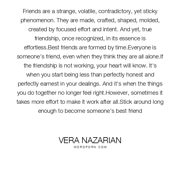 Friends are a strange, volatile, contradictory, yet sticky phenomenon. They are made, crafted, shaped, molded, created by focused effort and intent. And yet, true friendship, once recognized, in its essence is effortless.Best friends are formed by time.Everyone is someone's friend, even when they think they are all alone.If the friendship is not working, your heart will know. It's when you start being less than perfectly honest and perfectly earnest in your dealings. And it's when the things you do together no longer feel right.However, sometimes it takes more effort to make it work after all.Stick around long enough to become someone's best friend