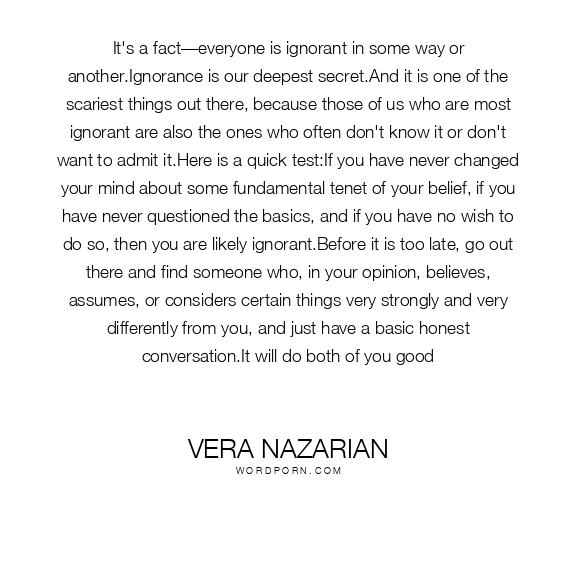 It's a fact—everyone is ignorant in some way or another.Ignorance is our deepest secret.And it is one of the scariest things out there, because those of us who are most ignorant are also the ones who often don't know it or don't want to admit it.Here is a quick test:If you have never changed your mind about some fundamental tenet of your belief, if you have never questioned the basics, and if you have no wish to do so, then you are likely ignorant.Before it is too late, go out there and find someone who, in your opinion, believes, assumes, or considers certain things very strongly and very differently from you, and just have a basic honest conversation.It will do both of you good