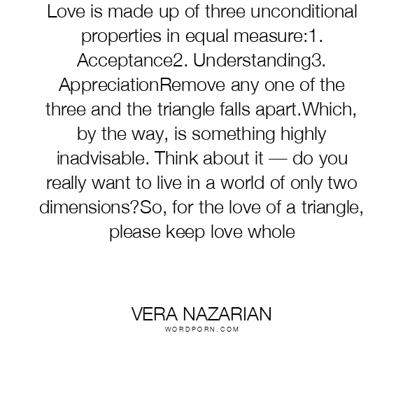 Love is made up of three unconditional properties in equal measure:1. Acceptance2. Understanding3. AppreciationRemove any one of the three and the triangle falls apart.Which, by the way, is something highly inadvisable. Think about it — do you really want to live in a world of only two dimensions?So, for the love of a triangle, please keep love whole