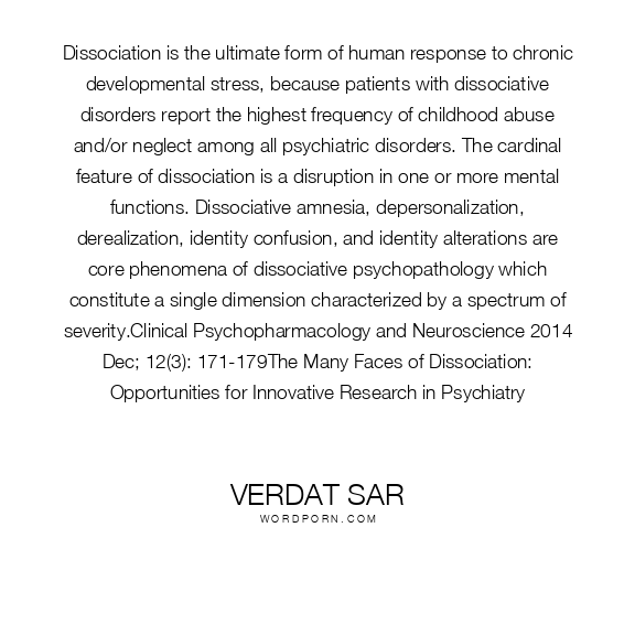 Dissociation is the ultimate form of human response to chronic developmental stress, because patients with dissociative disorders report the highest frequency of childhood abuse and/or neglect among all psychiatric disorders. The cardinal feature of dissociation is a disruption in one or more mental functions. Dissociative amnesia, depersonalization, derealization, identity confusion, and identity alterations are core phenomena of dissociative psychopathology which constitute a single dimension characterized by a spectrum of severity.Clinical Psychopharmacology and Neuroscience 2014 Dec; 12(3): 171-179The Many Faces of Dissociation: Opportunities for Innovative Research in Psychiatry