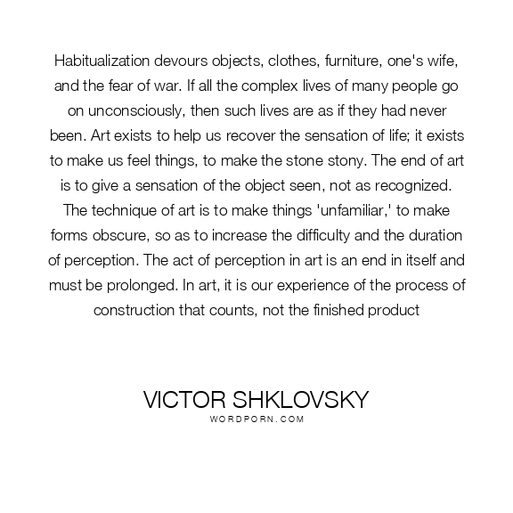 Habitualization devours objects, clothes, furniture, one's wife, and the fear of war. If all the complex lives of many people go on unconsciously, then such lives are as if they had never been. Art exists to help us recover the sensation of life; it exists to make us feel things, to make the stone stony. The end of art is to give a sensation of the object seen, not as recognized. The technique of art is to make things 'unfamiliar,' to make forms obscure, so as to increase the difficulty and the duration of perception. The act of perception in art is an end in itself and must be prolonged. In art, it is our experience of the process of construction that counts, not the finished product