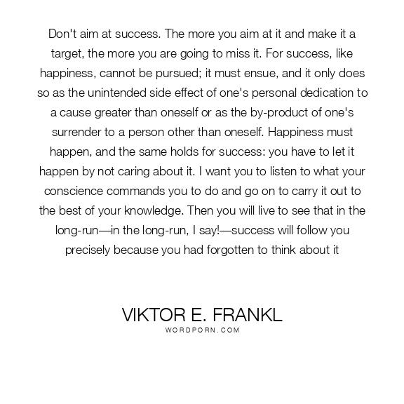 Don't aim at success. The more you aim at it and make it a target, the more you are going to miss it. For success, like happiness, cannot be pursued; it must ensue, and it only does so as the unintended side effect of one's personal dedication to a cause greater than oneself or as the by-product of one's surrender to a person other than oneself. Happiness must happen, and the same holds for success: you have to let it happen by not caring about it. I want you to listen to what your conscience commands you to do and go on to carry it out to the best of your knowledge. Then you will live to see that in the long-run—in the long-run, I say!—success will follow you precisely because you had forgotten to think about it