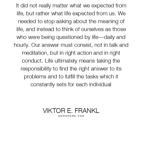 It did not really matter what we expected from life, but rather what life expected from us. We needed to stop asking about the meaning of life, and instead to think of ourselves as those who were being questioned by life—daily and hourly. Our answer must consist, not in talk and meditation, but in right action and in right conduct. Life ultimately means taking the responsibility to find the right answer to its problems and to fulfill the tasks which it constantly sets for each individual